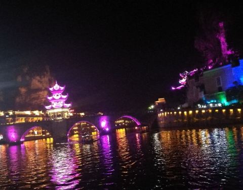 镇远古城的确很美,舞阳河蜿蜒流过,灵动秀丽。 全天都可乘船观光,但到晚8点后才看到灯光璀璨的效果。 比较遗憾的是船上不讲解。