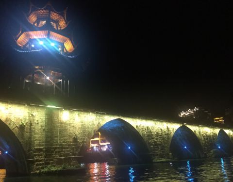 镇远古桥最美的莫过是夜景,走在古城步行街上,古城是热闹,灿烂的,如果船游古城,两岸灯光倒映水中,船游于有灯光摇曳的水中……