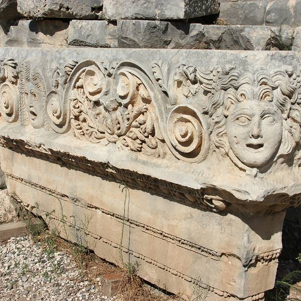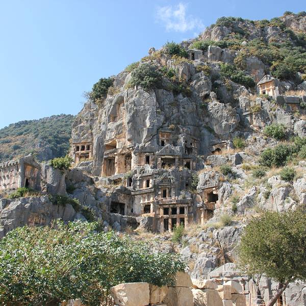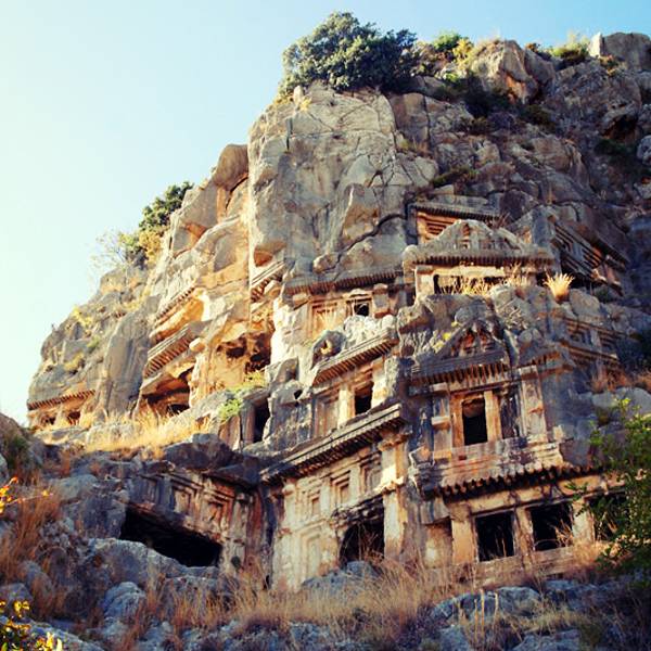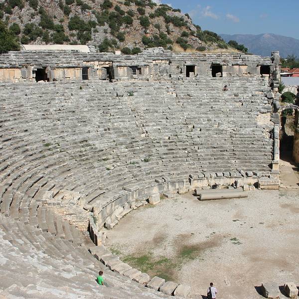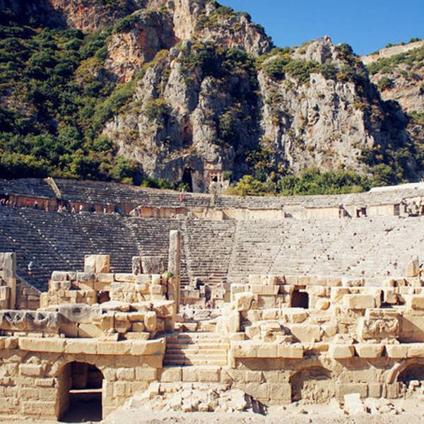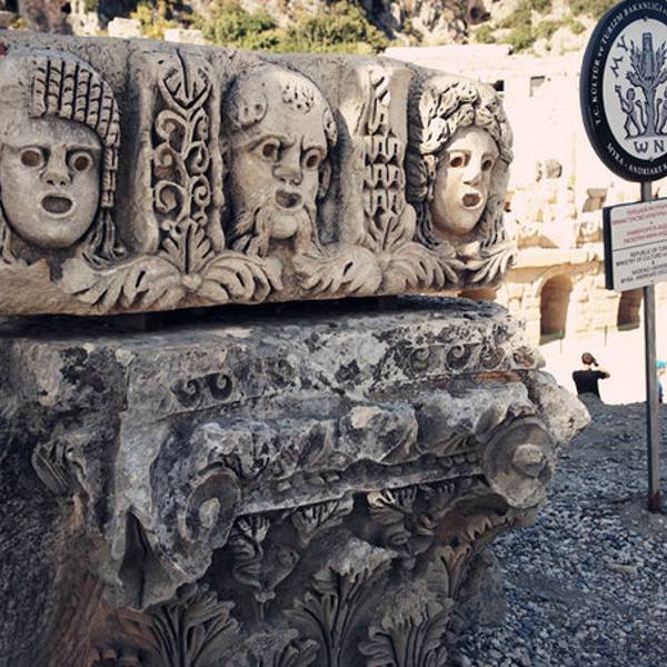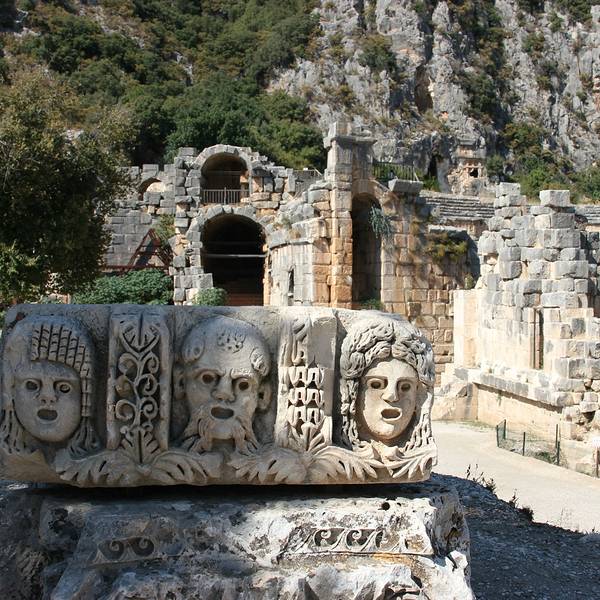 Myra是当年的lycia重镇,和Xanthos, Patara, Pinara, Tlos, Olympos一起,是当时lycia重要的几大城市。虽然当时在一起只算得上是平分秋色,不过今天的myra以其保存完好的历史遗迹获得了更多游客的青睐。Myra得名于一种采自木本植物的香料,还有一个很美丽的传说关于这个被变成香木的漂亮女孩。 Myra的古城遗迹很紧凑,环形剧院和岩体棺木的总面积并不大,但是却非常独特。 环形剧院的脸谱雕塑和其他罗马古城精致细腻的舞台神像雕塑不一样,充满了神秘而又沧桑的气质,那空空的大眼睛似乎又充满了一切神情的凝视着上千年历史的更迭变迁,也似乎要吸引了关注者的魂魄和精神一般。