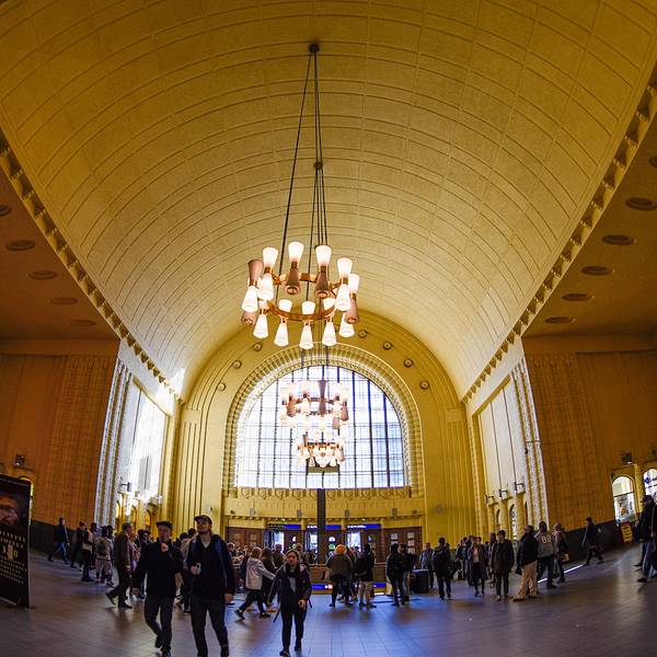 左右两边分别是餐厅和售票处,还有旅游服务中心,可以买到赫尔辛基的旅游交通卡从赫尔辛基大教堂出来,步行至中央火车站也只要短短的几分钟时间,所以在市中心真的都只要靠走就行。中央火车站特别古典,外观很有气势,大门两边各有两个彪悍的石人托着大圆球,有点儿门卫四大金刚的意思,在这...从赫尔辛基大教堂出来,步行至中央火车站也只要短短的几分钟时间,所以在市中心真的都只要靠走就行。中央火车站特别古典,外观很有气势,大门两边各有两个彪悍的石人托着大圆球,有点儿门卫四大金刚的意思,在这里感觉全赫尔辛基的人都聚集于此,门口的电车站来来往往异常繁忙。走入大门来到火车站的大厅,情不自禁感觉时光倒流,高高垂下的巨大吊灯,圆形方格的玻璃窗,淡雅的复古黄墙壁和天花板。左右两边分别是餐厅和售票处,还有旅游服务中心,可以买到赫尔辛基的旅游交通卡。