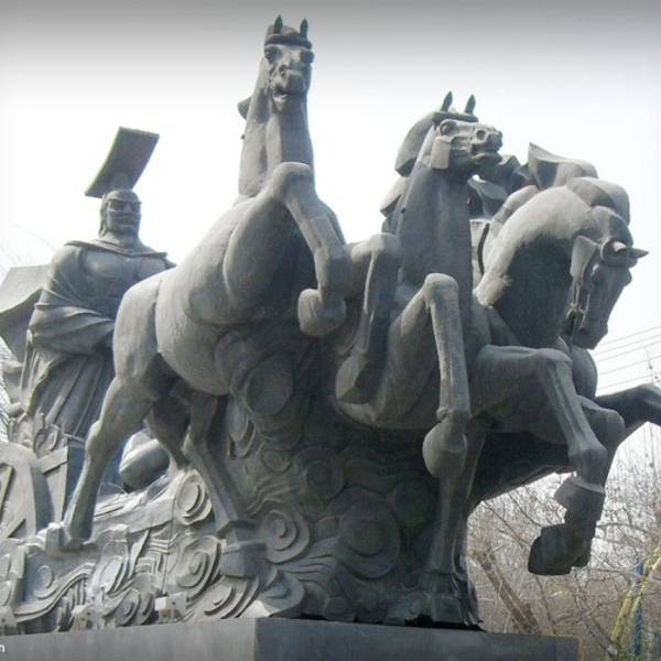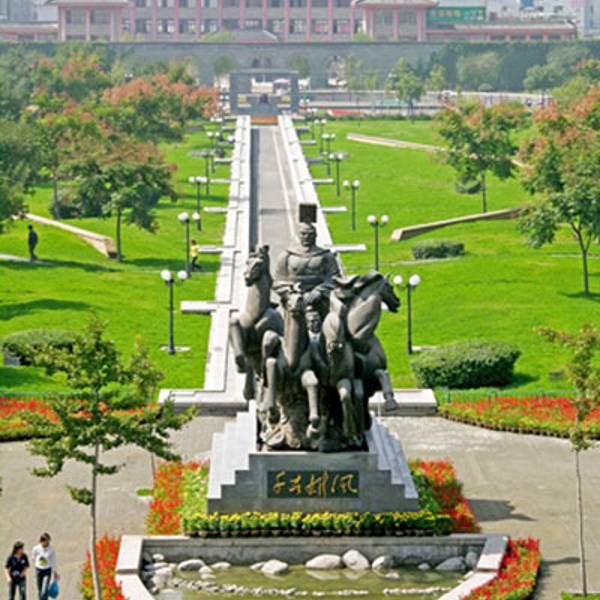 中华广场占地面积34.5亩,东西长约360米,南北最宽处125米,呈三角状傲立于咸阳西部,其设计主题思想是以中国第一个皇帝秦始皇东征时之铜车马雕塑(又名千古雄风)为主线,广场分为东、中、西三个部分。西端为下沉式广场,象征秦皇宫,面积约5000平方米。在“宫”的中央有一“九宫”,寓意着“九九归一”。在”宫”的东端有形象抽象而逼真的“二龙嬉珠”,它暗芷机关,当打开水池中水泵时,立即会从“二龙”的尾巴卷下一道水帘,同时,站在北侧看,位于“二龙”两头之间的大理石圆球就会匀速顺时针而转动,有人说它象征着我古城咸阳的财运会滚滚而来。在“宫”的两侧是一仿古建城墙,有人说它似一道屏风,有人说它似“皇宫”的城墙,还有人说它是整个广场的“画龙点睛”。在城墙的两侧,现已建成约有5亩多的小型儿童游乐园,它备受西郊儿童的喜爱。