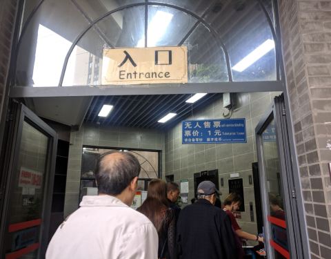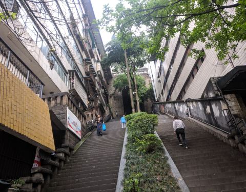 搜一下电子地图发现乘公交车很绕脚,步行倒是挺便利的,距离不远,正好来个“饭后百步走”,溜溜食儿...一顿火锅涮下来,酣畅淋漓。结账消费97元,感觉相当合算呀!出门时发现,已经快要到晚饭点了,餐馆已经在上客人了,诺大的餐厅里已经坐了十几桌了。看着我们往外走,他们的眼光有点惊讶的神色,一定是以为我们这...一顿火锅涮下来,酣畅淋漓。结账消费97元,感觉相当合算呀!出门时发现,已经快要到晚饭点了,餐馆已经在上客人了,诺大的餐厅里已经坐了十几桌了。看着我们往外走,他们的眼光有点惊讶的神色,一定是以为我们这俩“吃货”从中午一直涮到现在了吧?从储奇门回酒店,搜一下电子地图发现乘公交车很绕脚,步行倒是挺便利的,距离不远,正好来个“饭后百步走”,溜溜食儿,还能看看街景呢。沿着凯旋路往北走,没想到没走多远就遇到了一个需要选择的问题:有一个很高的大坡需要过,过法有二:步行走台阶或者坐电梯。紫檀有心数一数台阶到底有多少级,又担心喵喵痛恨上台阶(以前徒步峨眉山留下的后遗症),于是建议喵喵坐电梯上到顶层等待,自己徒步去汇合。没想到,酒足饭饱的喵喵居然意外地也要步行走楼梯,于是我们俩并肩前进,数起了台阶。凯旋路,从储奇门出来就是这条路,一直往北走就能到解放碑。途径一个大高坡,有电梯和台阶供路人选择。我们选择了台阶。一步一步拾级而上,细细数下来,一共是186级台阶。台阶中段的平台上还有人在打麻将,居然还有观战者呢。从顶部平台往下看,真够深的,我们还真没少上行呀!凯旋路电梯入口,票价1元,不贵! 展开