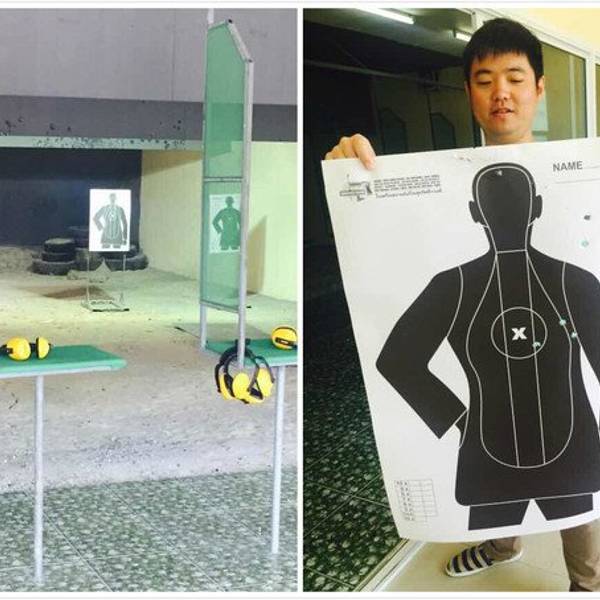 吃完早餐只有2个小时可以游荡,我们也不知道能干点啥,就在爆哥强烈要求之下去了一个射击场shooting range打靶。 因为泰国枪支是合法的,所以靶场都是真枪实弹的射击。 爆哥选择的9mm奥地利某种手枪,10发子弹1680泰铢+靶纸30泰铢。