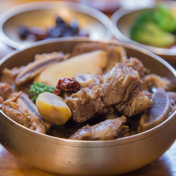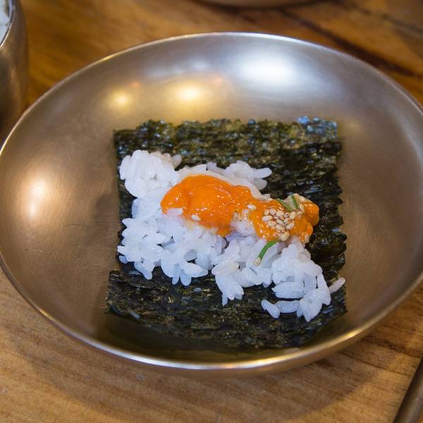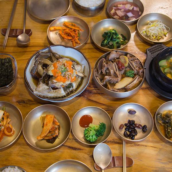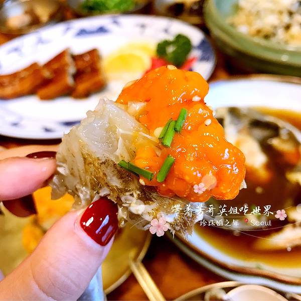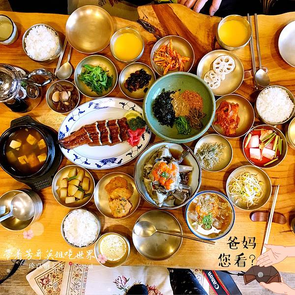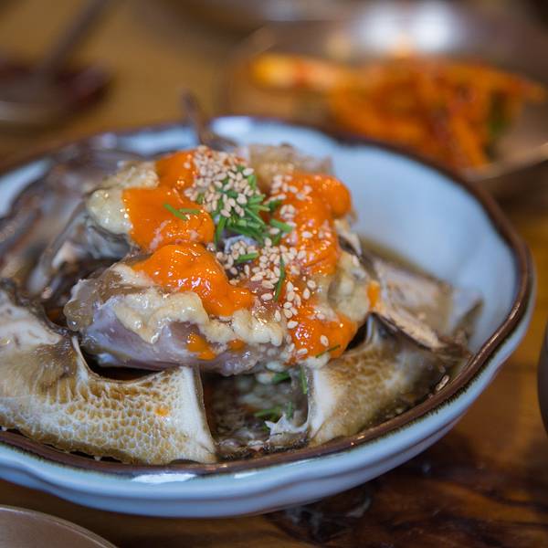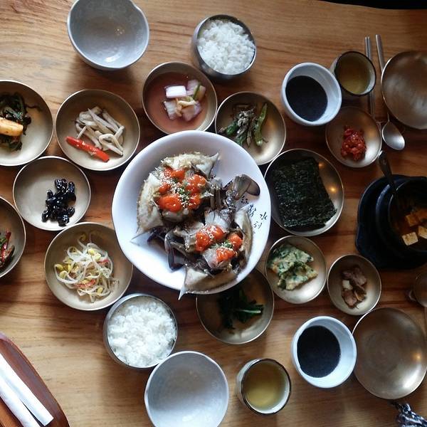 3.大瓦房酱蟹 如果大家和我们一样,有一天的时间安排在北村韩屋村和景福宫,那么在大瓦房酱蟹品尝午餐是一个很不错的选择。 大瓦房酱蟹可以说是距离首尔主要景点最近的一家米其林餐厅了,离景福宫只要步行10分钟的距离,不需要预约,午餐中午12点准时营业。 这家是需要点餐的,说是点餐,其实就是每人点一道主菜,其他的小菜摆满一桌子免费添加。我点了一只酱蟹,妹妹点了牛排骨汤。稍微等了一会儿就上菜了,一下就摆满了一大桌。最抢眼的是腌制好的蟹黄,看着真诱人啊。酱蟹的吃法有很多,服务员介绍的是拿一片海苔,先铺上米饭,再放上蟹黄,卷在一起放进嘴里,旁边一些当地人还会把米饭放到蟹壳里和蟹黄汤汁一起搅拌着吃。 蟹黄略微有些腥,配上汤汁的酒糟味刚刚好,蟹肉轻轻一嘬就可以从蟹腿里嘬出来,非常好吃。牛排骨汤有些甜,牛肉炖的非常软烂。大瓦房酱蟹的味道确实可圈可点,尤其是酱蟹,真的能吃出鲜美的感觉,但离让人惊艳还有些距离。便利的地理位置,平易近人的价格,是家比较推荐的餐厅。只不过餐厅的服务有些糟糕,按呼叫器从来没有回应,只能大声的喊服务员过来,服务员的意识也非常差,算是美中不足吧。