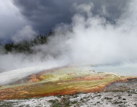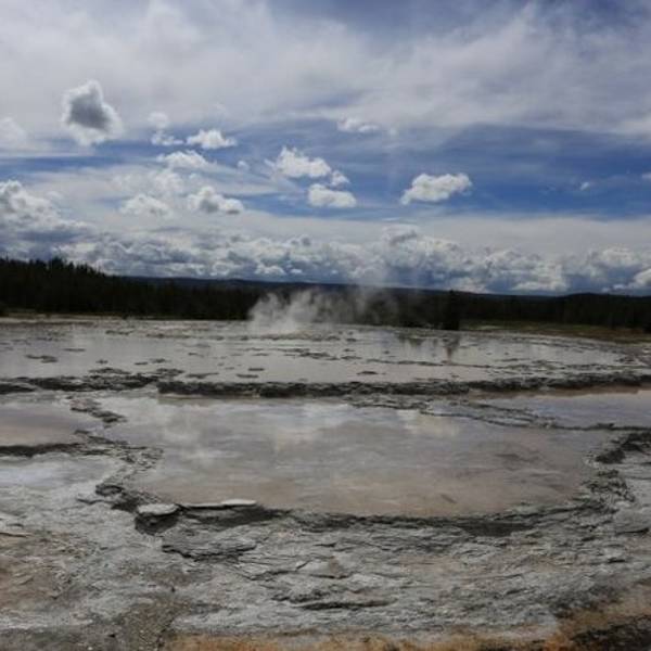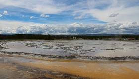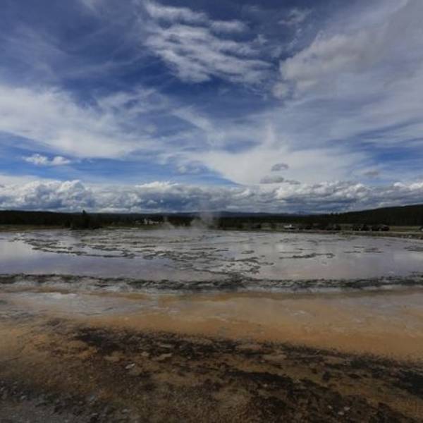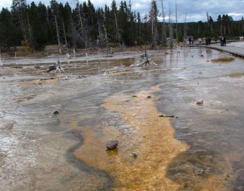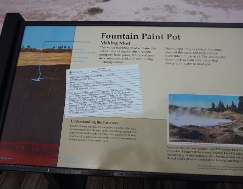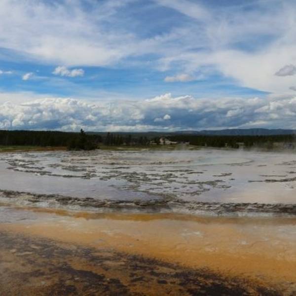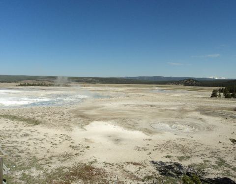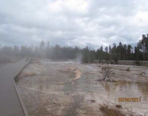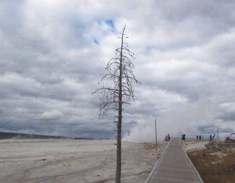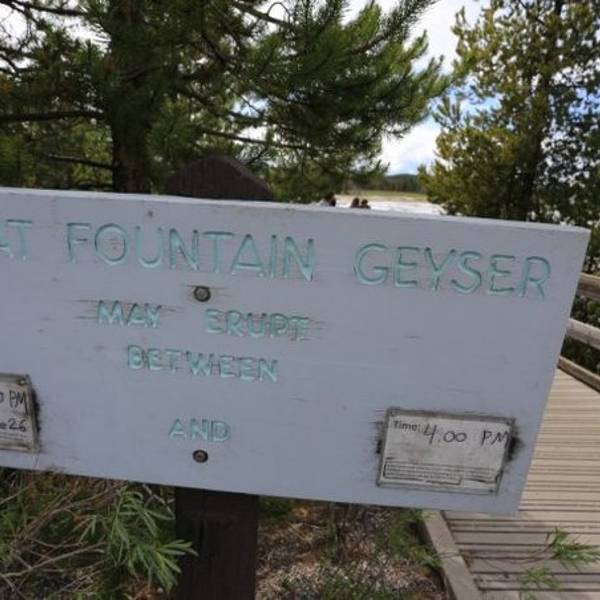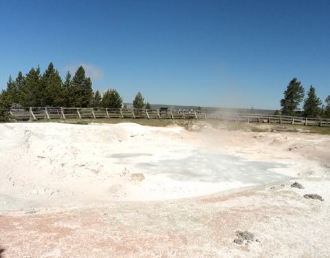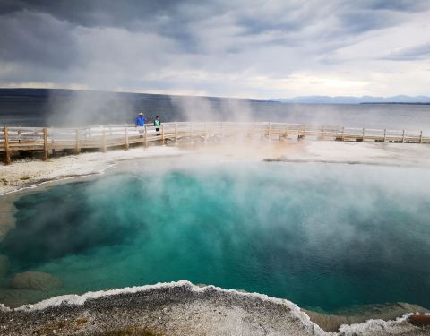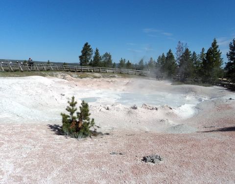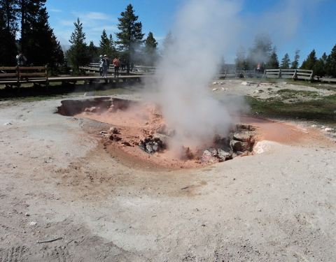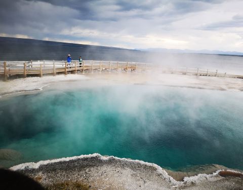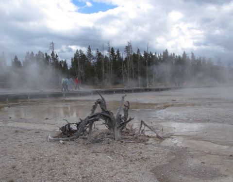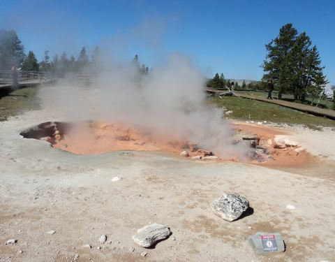 不同于”老忠实“几乎可以精准地预测,公园对great fountain geyser的喷发预测是在12:00PM-4:00PM之间,我们到达的时候是三点半左右,大喷泉周围的椅子上坐了许多人,池中央的热水每一次较大的沸腾都会引起人群一阵激动,可惜每次都只是”烟雾大,喷水小“,等了好一会,我们纠结了,前面还有好多景点要看,而这里的等待太无确定性,该怎么办?