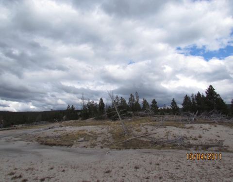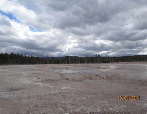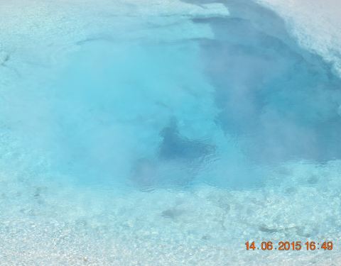 等我们第二次来到这里已经5点半,人群大多已经散去,只剩几个坚守的游客,问了其中一个女孩,她说她已经在这里等了一个下午,一直没有离开过,而喷泉还没有喷发。听她这样说,我们也就决定在这里”死磕“了,于是回去车上拿了薯片、咖啡,可惜等我们吃完一整桶薯片,喷泉还是没有一点要爆发的迹象!而这时,来了一个公园的工作人员,带了几个乘坐公园游览车的游客过来,我问她:”你看这个喷泉大概还要多久会喷发?“,工作人员摇摇头:”我想它今天也许不喷发了。“那个从头到尾等待的女孩不死心,说:”我都等了一个下午了,不想现在走。“工作人员实在不忍心再给她无谓的希望,只好直截了当地说”从现在的情况判断,今天不会喷发了。“女孩哀怨地回了一句:”我等了那么久,看white dome geyser都喷发了六次了!!!“剩下的所有游客都只好悻悻地离开。