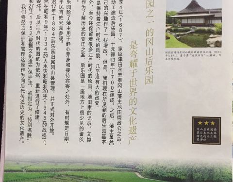 后乐园是获得米其林三星评级的特别庭院,属于日本三大名园之一后乐园是获得米其林三星评级的特别庭院,属于日本三大名园之一。它的规模相比兼六园来讲稍微小一些,视野更加的开阔,主要是整个后乐园基本上都是广阔的草坪,树木并不多,站在一个小坡上,基本上就能把整个后乐...后乐园是获得米其林三星评级的特别庭院,属于日本三大名园之一。它的规模相比兼六园来讲稍微小一些,视野更加的开阔,主要是整个后乐园基本上都是广阔的草坪,树木并不多,站在一个小坡上,基本上就能把整个后乐园的景观收入眼底。但是走在园区内,依然能够感受到一步一景的精心设计。很遗憾,我们去的那一天天气很阴,虽然避免了大太阳下的酷晒,但是我相信,晴天的话,这里会非常的漂亮。 展开