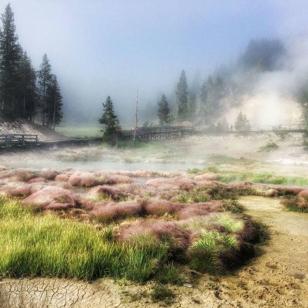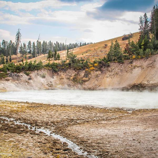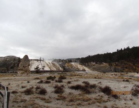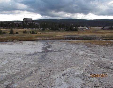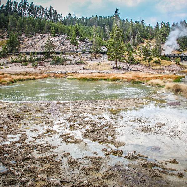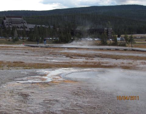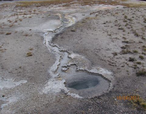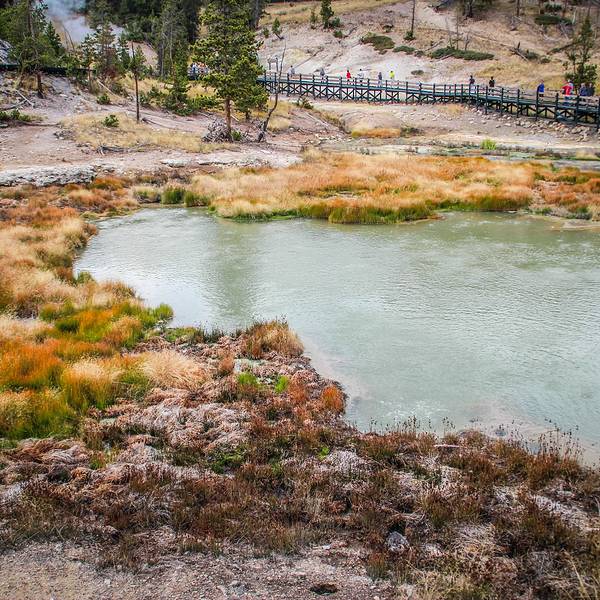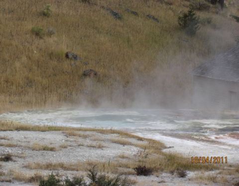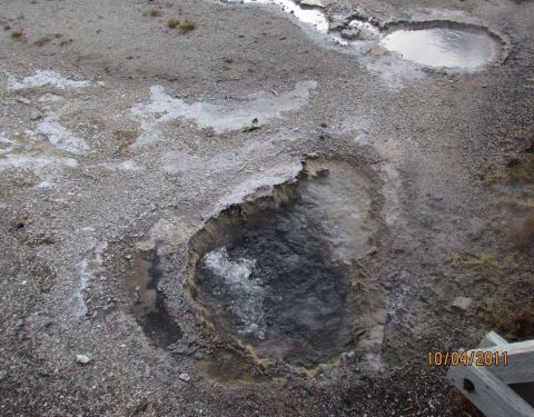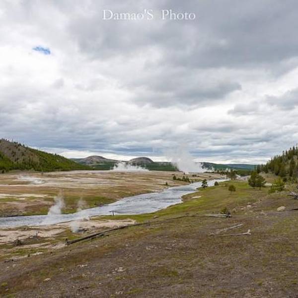 ...个温泉池,我们参观时就是处于宁静状态,没有一点“泥”的样子,远处森林间的蓝色水域是著名的黄石河泥浆锅(Mud Caldron),离入口很近,一片冒烟的稀泥池,旁边有刚被野牛践踏的痕迹。