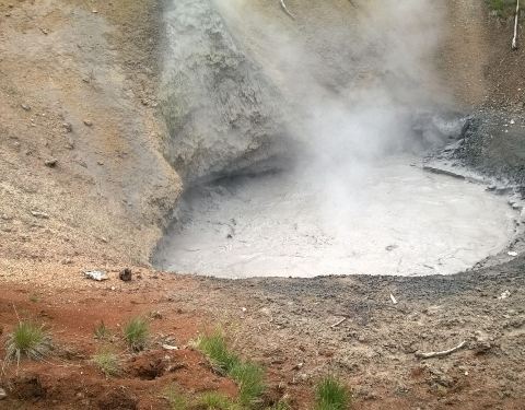 有栏杆和栈道保护游人行走观看。池子的尺寸不大,有几个在这个区域分布所谓的泥火山就是从地下向外喷发的泥浆池,翻滚带有气泡,并冒着白气。池子的尺寸不大,有几个在这个区域分布。有栏杆和栈道保护游人行走观看。