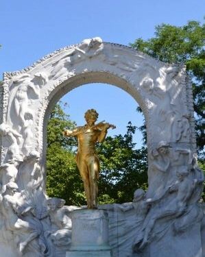 瞻仰维也纳地标之一:奥地利音乐大师约翰·施特劳斯的镀金雕像。