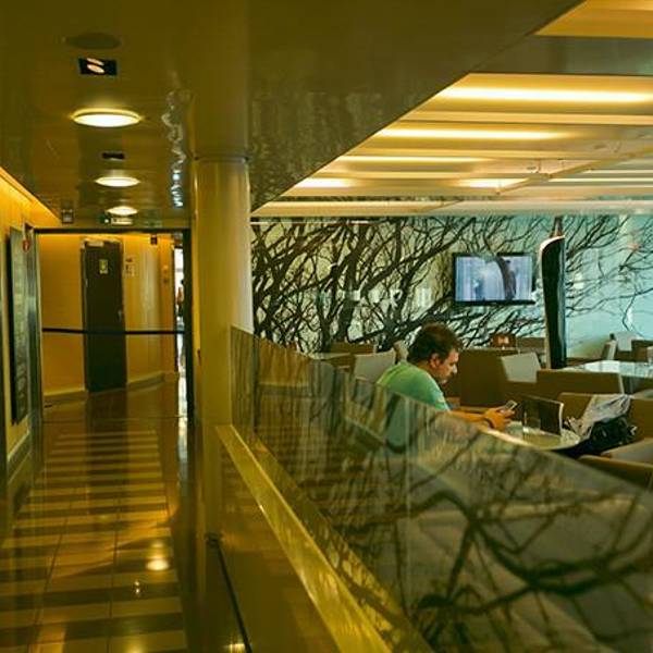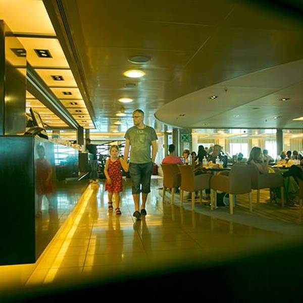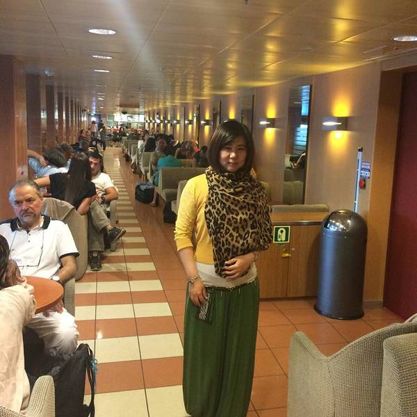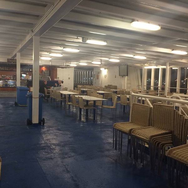 雅典天亮的很晚,我们早上六点起床赶往码头的时候,天空连微亮的意思都没有。Piraeus港口却热闹异常,靠岸的大船灯火通明,透过船窗看进去都是人头攒动,船务公司也是人声鼎沸,挤满了取票和准备登船的游客们。从...雅典天亮的很晚,我们早上六点起床赶往码头的时候,天空连微亮的意思都没有。Piraeus港口却热闹异常,靠岸的大船灯火通明,透过船窗看进去都是人头攒动,船务公司也是人声鼎沸,挤满了取票和准备登船的游客们。从来没有坐过大轮船的我,兴奋异常,看什么都新鲜。上船的档口总共有三条,左边供行人通行,中间最宽,可供小轿车直接开入船舱中,右边是搬运货物的通道。踏上甲板以后发现船里竟然还有扶手电梯!我们按照工作人员引导找到了自己的船舱,空间宽敞,舱位比普通的飞机舱位要大得多,前后都有可以置放行李的地方。舱内铺着厚厚的绒地毯,行李箱可以直接放在所有舱位的最前方,不用担心箱子会滚来滚去,而且在自己视线范围内也不用担心被别人误拿。