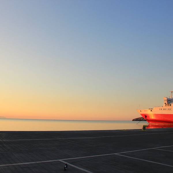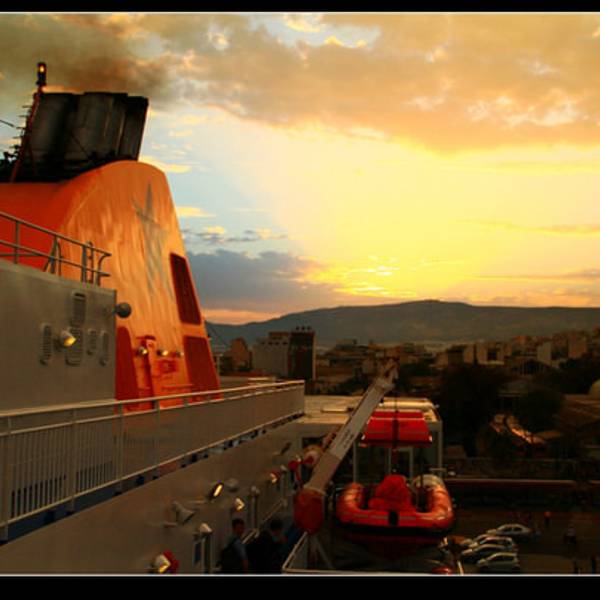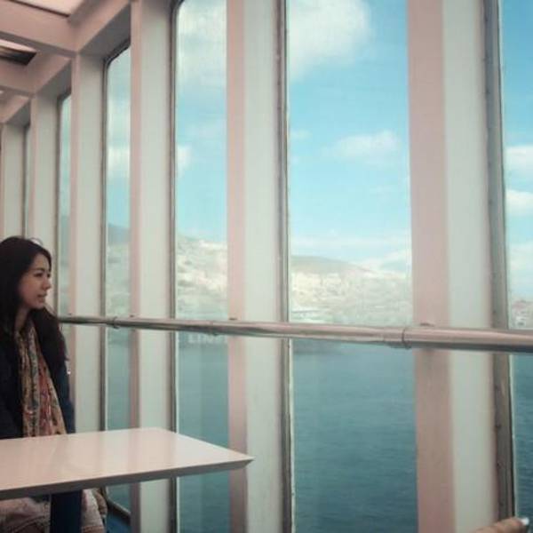 透过车窗的朝霞,好美。我们即将乘坐前往米克诺斯岛的邮船,六小时的船程,途中会经过克里特岛,邮船很大,