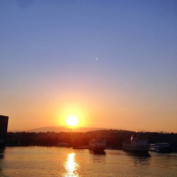 正点应该是7:25开船,7点刚过轮船已经开始鸣汽笛放音乐,提醒还没有码头上的游客们抓紧时间登船。我们站在甲板上看着晨曦中的雅典码头出神,短短十几分钟时间,天空从最初的鱼肚白慢慢过渡到淡粉再到橙红最后到艳丽的烫金色。因为懒而从来没有看到过日出的我,万万没想到,第一次看日出竟然是在爱琴海上,看着一轮橙红的太阳从雅典古城的建筑群中冉冉升起,在爱琴海上留下粼粼波光,内心的激动没办法用言语说明。船缓缓驶离比雷埃夫斯港,港口附近林立的高低建筑错落无序,陈旧黯淡,码头附近车流滚滚,行人如织,衬着晕红的晨光,这幅热闹却杂乱的画面竟然像极了儿时记忆中的家乡。90年代初的二线小城,也是这样陈旧灰暗的基调,但是人来人往,热热闹闹,人情味浓厚得很。