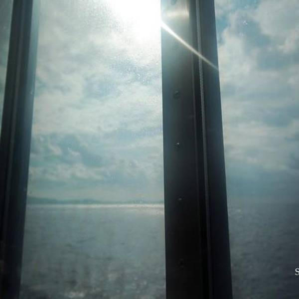- 透过车窗的朝霞,好美。我们即将乘坐前往米克诺斯岛的邮船,六小时的船程,途中会经过克里特岛,邮船很大,