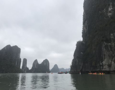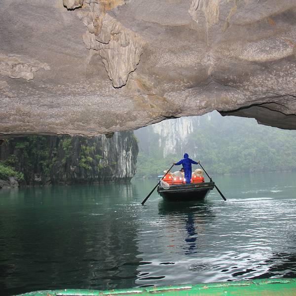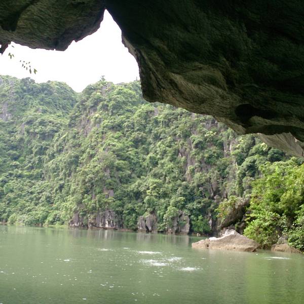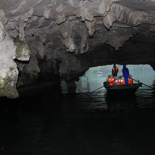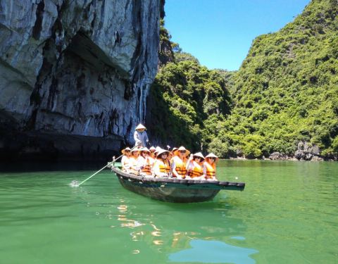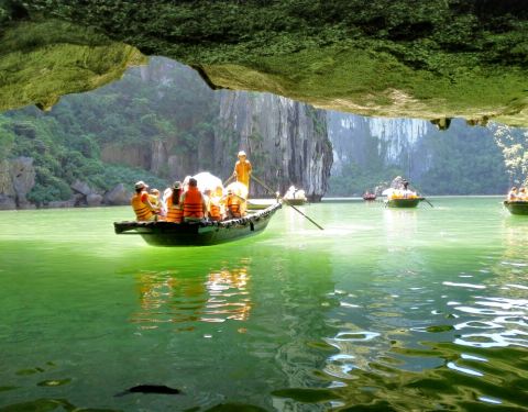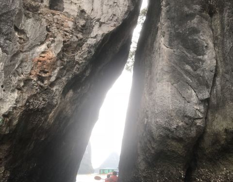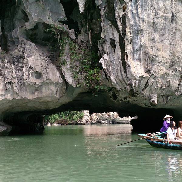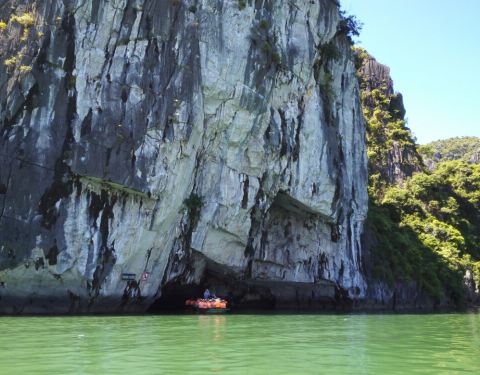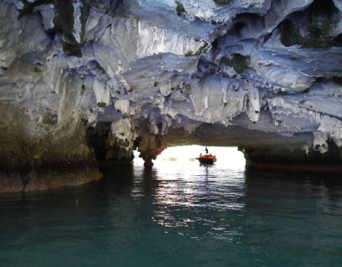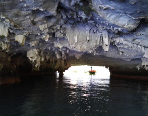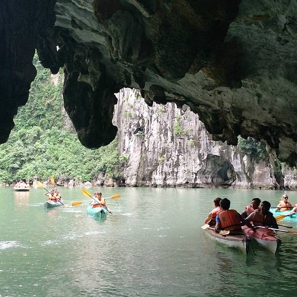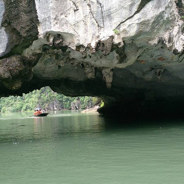 坐游船游下龙湾时的一个点,到了这时,导游会让游客下船到码头,然后可以换乘小船与可以自己划皮舟坐游船游下龙湾时的一个点,到了这时,导游会让游客下船到码头,然后可以换乘小船与可以自己划皮舟。除了划小舟能去穿过石洞外,几个人的船是只要在旁边拍下照。