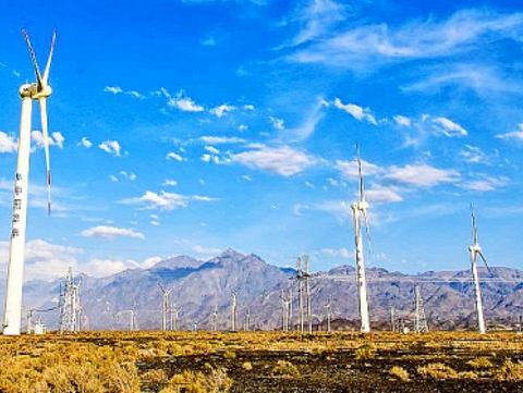 无数长臂风叶飞旋,延绵数十里。达坂城风力发电站是我国最大的风能基地。与蓝天、白云相衬,蔚为壮观达坂城风力发电站是我国最大的风能基地。在戈壁滩上,巨大的风车林立于道路两旁。无数长臂风叶飞旋,延绵数十里。与蓝天、白云相衬,蔚为壮观。