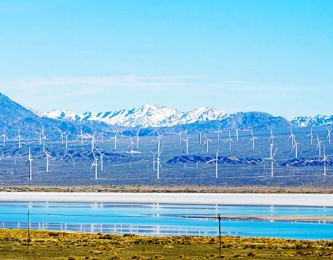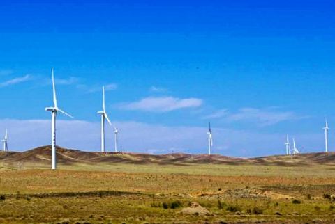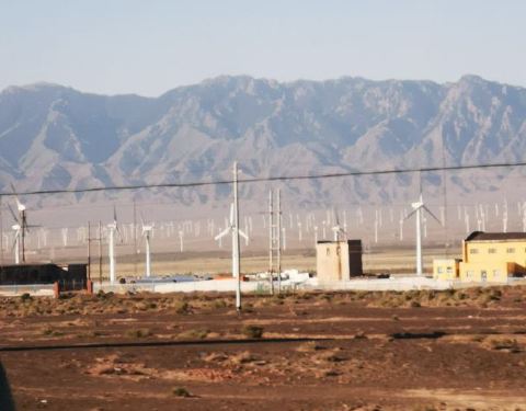拍摄戈壁之上的上百座巨大风车,景色十分壮观。