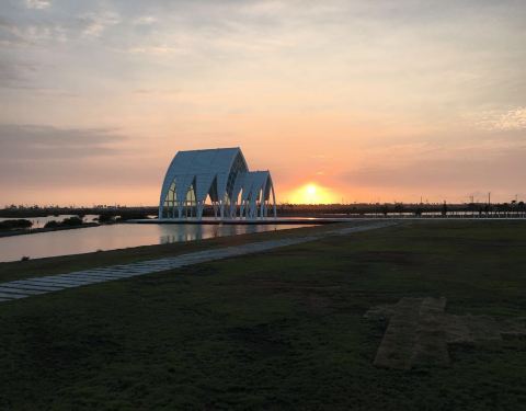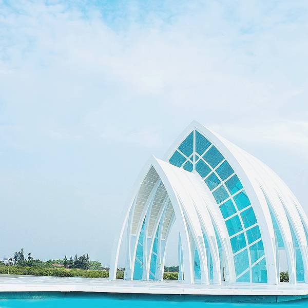北门水晶教堂,以盐田湿地为背景(跟上面的七股盐山不是一个区喔),半开放式白色钢骨建筑镶上水晶玻璃窗,立在一片浅水岛上,透过光影折射倒影,白色水晶教堂与倒影互相辉映,场景十分美丽。这里主要是婚纱的拍摄场地,若需要举办婚礼需要提前预约。不过来这里的交通不太方便,需要打车前往。 展开