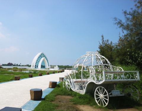 北门水晶教堂是云嘉南风景区管理处为营造婚纱场景筑建北门水晶教堂是云嘉南风景区管理处为营造婚纱场景筑建。以盐田湿地为背景,北门水晶教堂周边并巧搭浅水池,让游人得以欣赏晴空下教堂与倒影辉映美景。