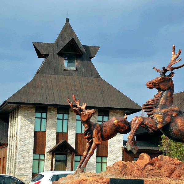 这里场地空旷,一座座折页屋顶的木头房子很有特色,一组向前奔跑的驯鹿群雕下镌刻着:“中国驯鹿之乡”,在蓝天白云的衬托下动感十足。这个季节几乎没什么游客,我们也没有进博物馆去看,好奇地在仅有几家仍在营业的商铺里转着看着。我对鹿角、树皮等用当地特产做成的工艺品很感兴趣;天晨却被商铺外几条懒散地眯着眼睛打着盹的狗狗吸引了眼球;媳妇对动物皮毛作成的服饰情有独钟,把看中的一顶外翻狐狸毛的帽子戴在了天晨头上,哇塞!那种林海雪原的感觉顿时出现在眼前;小薛也是看看这里,摸摸那里,还不时地问问价格;由于物品超出了我们的心理价位,最终只买了两瓶蓝莓汁饮料就此作别。 展开