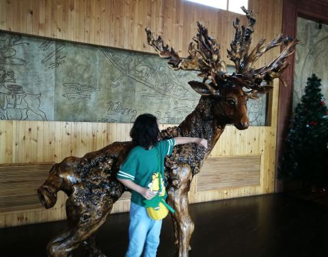 张大哥带我们首先来到了敖鲁古雅鄂温克族驯鹿文化博物馆。“敖鲁古雅”是地名,鄂温克语,意为“杨树林茂盛的地方”;“鄂温克”是我国的少数民族之一,意为“住在大山林中的人们”。他们藏于大兴安岭林区的林海雪原之中,坚守着最原始的狩猎方式,与驯鹿为伴,被称为中国最后的“狩猎部落”,是中国唯一饲养驯鹿的民族。