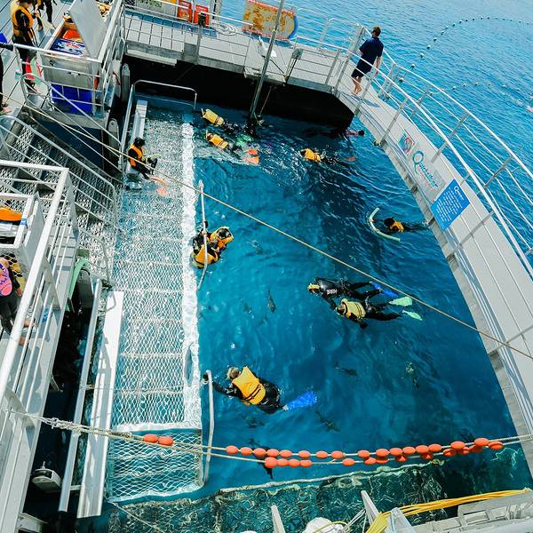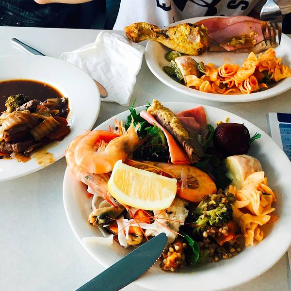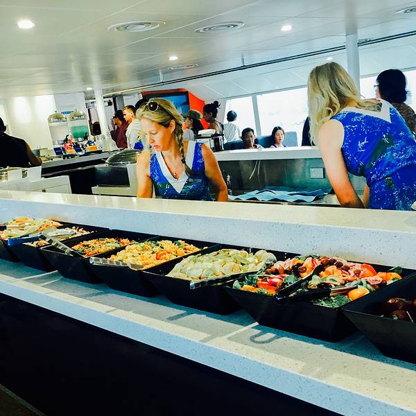 在车上补了一个小时觉,迷迷糊糊听着司机很热情地给大家指哪里容易看到袋鼠啦,凯恩斯以前的发展历史啦。很快就到了道格拉斯港,蓝天白云大太阳,安静的小港很好看~看~那个大铁疙瘩就是我们的银梭号啦~~ 还是挺酷的~船上有咖啡、茶、小饼干等给大家当早餐,开船之后就不供应茶水啦。道格拉斯到阿金考特珊瑚礁Agincourt Reefs的平台大概要2个小时40分钟的样子,但是这段时间一点都不无聊。银梭号的安全氛围确实很不错,在这段时间里,工作人员会给大家放各种安全小短片,科普小短片;还会教大家做好防晒如何使用潜水用具等。然后,会挨个问大家是不是需要租用潜水相机(很贵),水母衣(还好)等等~11点左右小姐姐们开始准备自助餐,菜品看起来不少~ 我们就坐在旁边的桌子,食物花花绿绿的我两以为很好吃,所以一直傻傻地盯着等开饭~恩,给大家讲一下银梭号上面的活动项目~