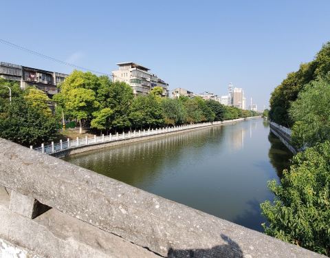 这是一条护城河,风光秀美。 这座桥屡毁屡修。最早是明代修建的。 现在河两岸绿树成荫,是广大市民的休闲好去处。 我也是无意之中在绿荫之下发现了这个桥碑。