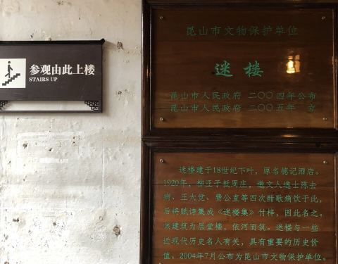 实用 风景宜人亦迷人”柳亚子赞扬水镇风光的迷楼了,在迷楼的大门口会有很大一块牌匾,里面很详细的介绍了...因为一句诗,一座楼而名扬天下,不仅仅有“先天下之忧而忧,后天下之乐而乐”范仲淹心怀天下的岳阳楼,也不只有“故人西辞黄鹤楼,烟花三月下扬州。”诗仙李白送别友人的黄鹤楼,在周庄古古镇也有“酒不醉人人自...因为一句诗,一座楼而名扬天下,不仅仅有“先天下之忧而忧,后天下之乐而乐”范仲淹心怀天下的岳阳楼,也不只有“故人西辞黄鹤楼,烟花三月下扬州。”诗仙李白送别友人的黄鹤楼,在周庄古古镇也有“酒不醉人人自醉,风景宜人亦迷人”柳亚子赞扬水镇风光的迷楼了,在迷楼的大门口会有很大一块牌匾,里面很详细的介绍了当年的柳亚子与迷楼的关系。而迷楼的具体的地理位置的话,是位于周庄景区的周边,如果由通秀桥检票口进入周庄景区即可直达景点,位于全福寺景点的后面,“蚬江渔唱”渔业馆的斜前方,花间堂的正前方,地理位置相对来说较为偏僻。迷楼并不是什么很大,是一座两层高的临河小楼,里面存放有一些文稿,没有多大的游玩价值,但是在二楼小楼上面可以欣赏到小桥的全景,大概游玩时间是在10分钟左右。而至于门票费用的话,迷楼不单独收取门票费用,包含在周庄景区的套票之中。据介绍,迷楼原本是一座德记酒店,古时候是专门提供餐饮的地方,整个酒楼整个是木质结构的,从外貌上来看还原保留了之前的风貌,整个酒楼显得较为精致小巧。一楼大厅基本上没有过多的摆设,可能也是因为一楼较为狭窄,如今里面只是用来存放一些文稿或者是记录文献,对于一般的游客来说着实较为无趣。通过一段木质楼梯即可上达二层,但是不得不说的就是楼梯一直摇摇缓缓的,感觉不是什么很安全。到达二楼之后,可以发现在迷楼的二层里面基本上是没有什么别致的东西,除去包房里面的雕塑,但是也不知道是木质的还是石制,倒是墙上挂了一些名人合影,文人古迹之类的,也是没有多大的游玩价值。在迷楼的第二层,还会摆设有一些较为古朴的椅子,但是似乎不允许使用,只是一个摆设物品。但是也不知道为什么在迷楼景点的话,也没有发现一个负责看管的工作人员,也许在周庄景区的话,也就只有沈厅、张厅等较为有名的景点需要查票了。不过不得不提的就是在迷楼二层的窗户,可以直接看到楼下的那一座不知名的古桥,河道里穿梭的小船以及河道对岸的街坊。勉勉强强算是一个可以值得拍照留恋的地方,如果感兴趣的朋友,可以选择在迷楼上拍摄在古桥上面的其他游客或者是朋友,也是不错的选择。而且在这里的话还可以观望到周庄水道里面的幽静以及对面酒楼的热闹嘈杂。在迷楼的二层的话,还有一件单独的房间,里面存放的几位文人墨客相聚畅谈的雕塑,至少从外表上看起来的话还是较为逼真的,颇有一番风味。