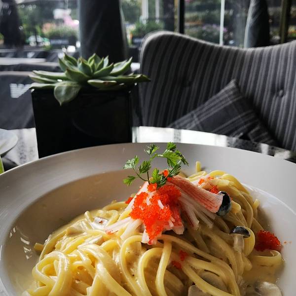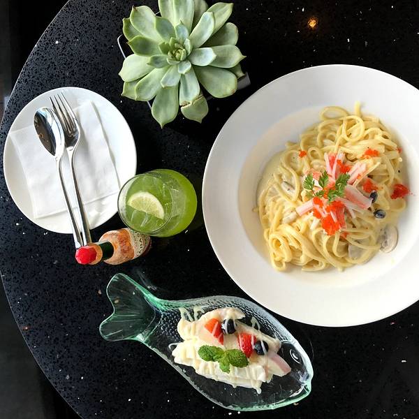 午餐决定在昨天就喵好的一楼阿玛尼餐厅。真的才知道阿玛尼还自带餐厅的!前面衣服饰品咱买不起,后面餐厅来逼格用餐下还是可以的!这里不仅环境优雅,服务生颜值高,而且偷偷告诉你们,价格一点不贵哟~~点了份芝士海鲜意面套餐,带上饮料和沙拉也才58,而且卖相精致口味好。关键是,在这用餐逼格值妥妥满满的!