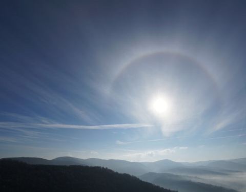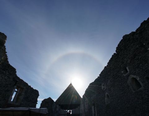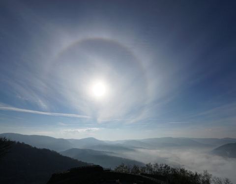 这天早上又是个大阴天,导游也说冬天来这里,大部分都是这样的天气,也没办法,语气中也是无奈和些许沮丧。一路向维谢格拉德驶去,渐渐地,起雾气了。接着似乎有阳光若隐若现,有点激动。之后,越接近目的地,雾气就越来越大,上山的时候整个大太阳展现在我们眼前了。导游说是我们人品大爆发。 阳光如此灿烂,心情顿时好靓。而且这天彩云古堡的景色属于难得一遇的,登上古堡后,非常非常厚的云雾,完全看不到山下的多瑙河以及村庄,仿佛置身仙境,这别样的风景真是千载难逢。古堡上也都是断壁残垣,很有历史感,还有一些陈列室可以参观。 最令人激动的时刻来了!彩虹!古堡上空居然出现了彩虹!!这天算是值了,真是要感恩所发生的一切,要牢牢记下这些美好的时刻。