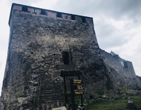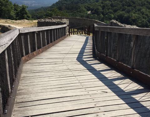 应该是属于当地人喜欢全家出行的地方,一路上碰到好多带小孩来参观的家庭,也算是进行历史教育吧,古堡不是很高,从木扶梯上去来到置高点沿另一边的坡路下山,一路风景不错,猛一回头发现下山的那条木栈道在高处...