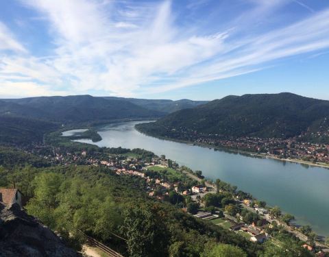 我们是从布达佩斯坐了一个小时的火车过去的,结果下火车后还需要走的河边坐船到河对面去,需要420福林一个人,而且一小时一般。坐到对面还需要走40分钟左右上山,如果自由行的话,请提前下好谷歌地图。 这些小镇没有bus,而且人不多,会英语的人更少。 布达佩斯880路车直接到山脚下,具体钱和时间就不清楚了。 站在山上看多瑙河还是很漂亮的。