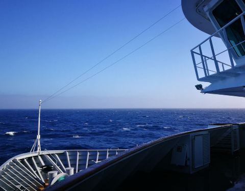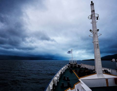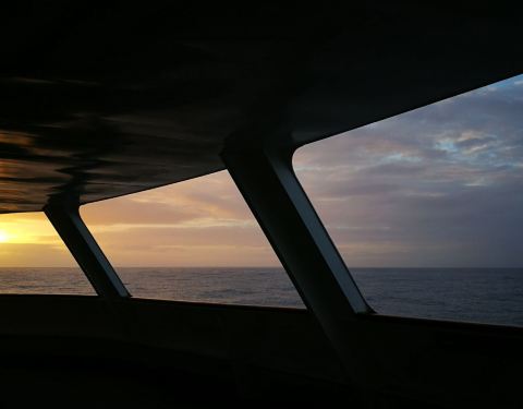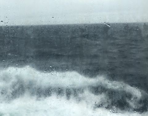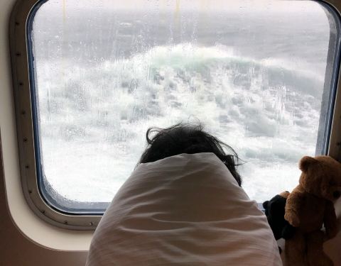 凌晨我们开始返航,进入德雷克海峡。早上风速每小时30海里(knots)以上,窗外风雨飘摇。去吃早饭的时候餐厅里的客人一只手能数过来,觉得自己还挺猛的,然而并没能得瑟很久。吃饭速度显然比平常慢了许多,有时候会试着望着远处海平面或者近处想找到一个不晃的点骗过自己的大脑。害怕嗜睡没有含速溶晕船片,害怕过敏没有贴膏药,听讲座的时候发现晃的太厉害实在扛不住了。赶紧吃了一颗迪迪的晕船药,抽了两个清洁袋就跌跌撞撞的冲下楼了。一坐到自己床上,头晕目眩想吐的感觉没有了。还是决定不上甲板整什么幺蛾子,碎!觉!摇摇晃晃的一下就睡着啦,连午饭都睡过去了。