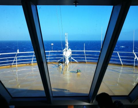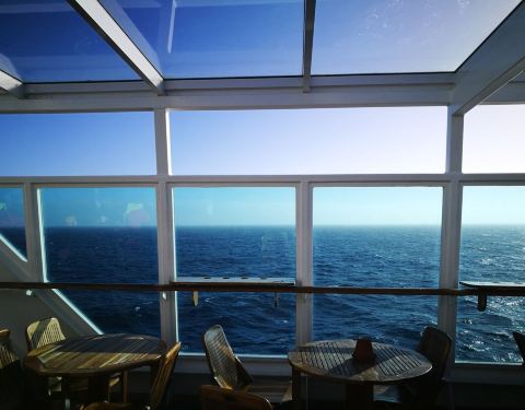 Artem说风从一边来,要待在船的另一侧稍微好些。后来在大厅(Discovery Lounge)见到经常在控制室碰见的老爷爷和我说控制室开了,但早上看我脸色不好就没告诉我。