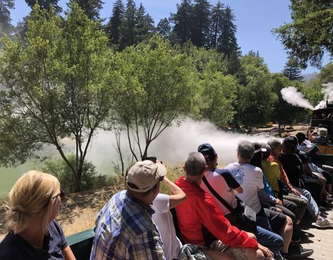咆哮山庄,坐坐红色蒸汽小火车,看看高耸的红杉树,小火车有户外的座位,也有室内的座位
