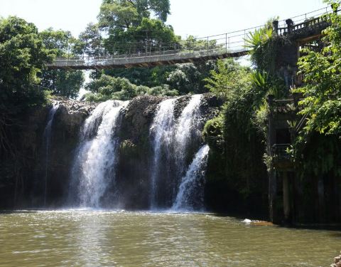 栈道围着窗帘树修建,让游客可以全方位感受这样的奇观。湖水清澈,有一种独特的魅力,让人的心境平静下来自驾大约30分钟后,我们来到了米拉米拉瀑布。米拉米拉瀑布是一个高18.3米的瀑布,知名度极高,是著名的广告取景地。因为外国人都很喜欢玩水,所以他们常常会在这个瀑布下游泳,即使现在天气有点凉爽他们也能玩得...自驾大约30分钟后,我们来到了米拉米拉瀑布。米拉米拉瀑布是一个高18.3米的瀑布,知名度极高,是著名的广告取景地。因为外国人都很喜欢玩水,所以他们常常会在这个瀑布下游泳,即使现在天气有点凉爽他们也能玩得很开心。窗帘树是热带雨林的奇观,两棵相连的无花果树形成了一棵如帘幕的树,约有700年之久。栈道围着窗帘树修建,让游客可以全方位感受这样的奇观。其实窗帘树也叫绞杀树,有点残忍,原本一颗小小的无花果落在了原本的大树上,种子开始发芽,并往下扎根,等到它完全将根扎进土里,它似乎已经把原来的树捆绑,然后使其倾倒,原来的树木被推倒。这斜斜的树干就是原本被推到的大树,外面被密密麻麻的绞杀树的根包围着,使原本的大树动弹不得,再也没有生存的机会,感受到大自然的物竞天择。下一站我们来到巴林火山湖,这里有着原始森林特有的幽静,考里松在这里安睡了千年。湖水清澈,有一种独特的魅力,让人的心境平静下来。这里也是看夕阳的好地方,太阳光洒在湖面上,据说这里还隐藏了很多野生动物,猝不及防就会出现。还可以在这里休闲地享用下午茶。 展开