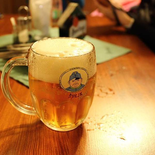 泰尔奇的这家帅克餐厅在广场西北角,位置很好。帅克餐厅的标志性啤酒杯