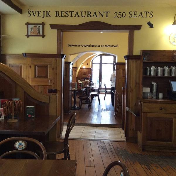 取典于《好兵帅克》这部小说中的同名人物。餐厅门面不大,通往大厅的走廊灯光昏黄。菜品有烤乳猪,烤肘子,烤鸭等,分量足,菜价不高。配菜多半是欧洲各国都爱吃的红菜。主食是一片片精粉馒头片,里面加了蛋奶,口感细腻,有不同口味。大厅服务员身穿奥匈帝国的服装,穿着旧时服装的乐手,吹拉弹唱着捷克传统民谣。