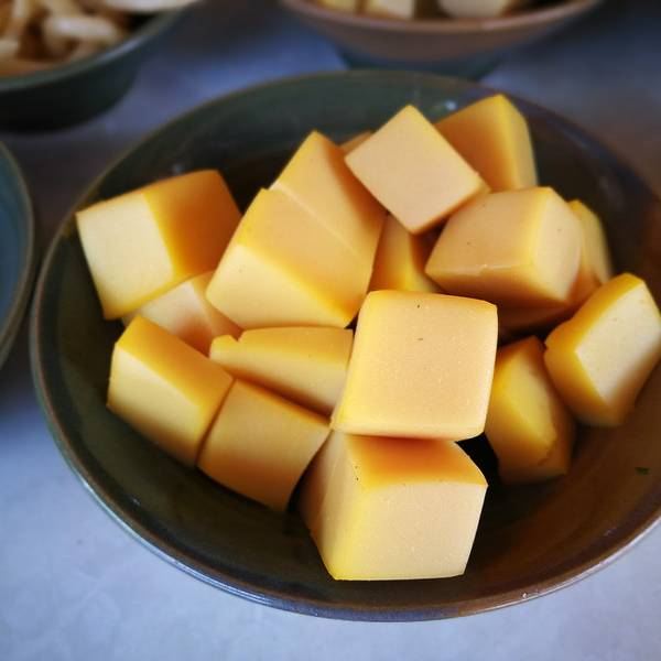 新场古镇的小吃 老豆干也是新场的名产之一,大只的豆干一只不过一元钱,蘸着干辣的辣椒面食用,绝对是素食界的霸主。