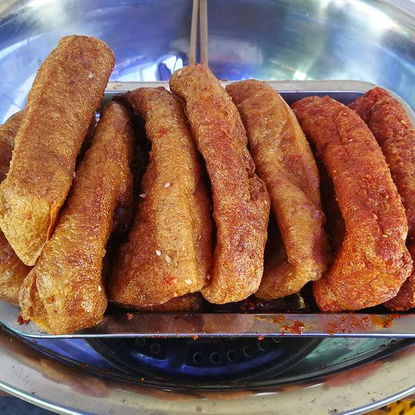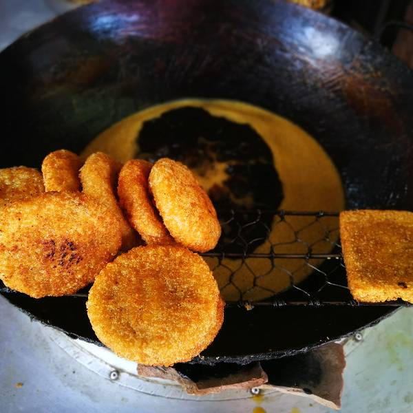 新场古镇的小吃 新场有多家油糕店,都是老字号,用糯米炸制得金黄酥脆的外壳,包含着甜香解腻的红豆沙,3元一只。