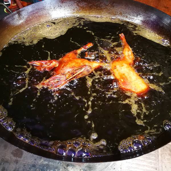 新场古镇的小吃 油烫鸭是新场的名特产之一,鸭肉本身略微带有的腥臊在特制作料以及油锅的烹炸下成就了一方美味。
