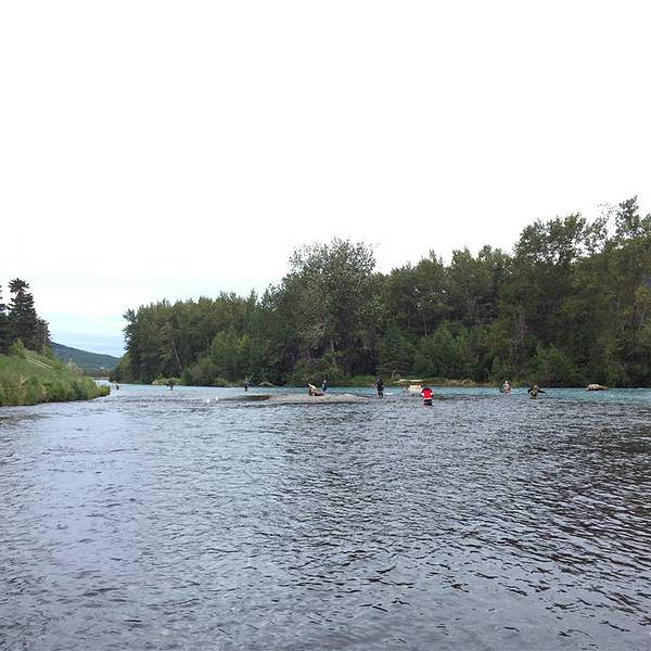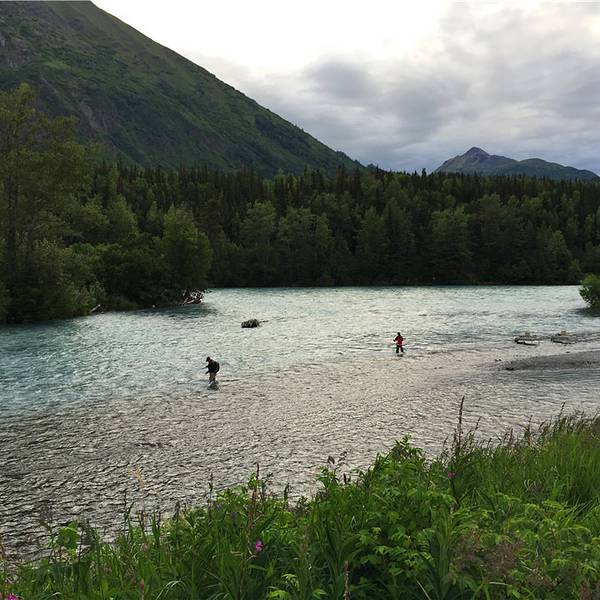 【体验】鉴于黑夜就两个小时,我们早早的就去钓鱼了。奇奈河和俄罗斯河交界处就是最佳钓鱼地点这就是钓鱼的地方啦,还没到河边就看到那一个个小黑点了,没错,全部是住在附近热爱钓鱼的大爷大叔们。奇奈河的水是碧蓝碧蓝的,俄罗斯河则清澈见底,交界处有明显的界限,非常神奇。我们的成果是两条纯天然野生阿拉斯加彩虹鳟鱼。