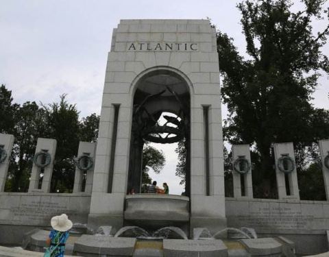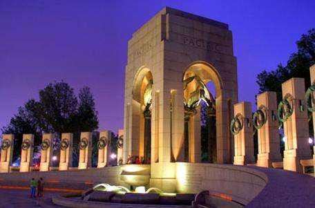 美国国家二战纪念碑位于反思池与华盛顿纪念碑的中间,为纪念在二战期间服役的1600万美国军人而建,整体呈一个下沉的椭圆形广场,四周环绕的56个白色花岗岩纪念碑,分别代表了当时美国的每一个州和海外领属地,而碑群中间便是一个偌大的喷泉。 1. 两大拱门 椭圆形碑群的两端各有一个巨大的花岗岩拱门,分别象征着二战时期的太平洋战场和大西洋战场,每个拱门内都各有三只铜质美国雄鹰的雕像,共同托起了象征胜利的花冠。 2. 自由墙 在广场的西侧有一处弧形的自由墙,上面镶嵌有4000颗夺目的金星,每一颗都代表着在二战中牺牲的100位美国士兵。而在东侧入口两旁还有很多浮雕,记载下二战的峥嵘岁月。