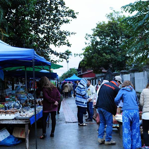 琅勃拉邦的早市,因为老挝的特殊地理位置和综合当地人的饮食习惯,所以经常看到早市上如江鱼,鸟类,麂子,野猪,松鼠,龟,大蜥蜴,螺蛳,虾,螃蟹,青蛙,大蟋蟀,蚕蛹,大蝌蚪,甲虫等等属于老挝人的生态健康的食材,逛早市也是一种能够多了解当地老挝人生活的方式之一。早市位于老挝琅勃拉邦市中心,皇宫的左侧门旁,距离湄公河60-70米。老挝旅游城市琅勃拉邦距离西双版纳磨憨口岸298公里。