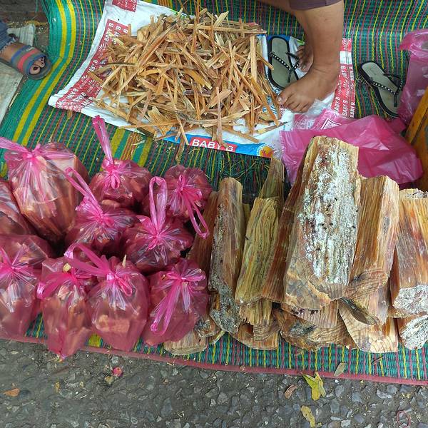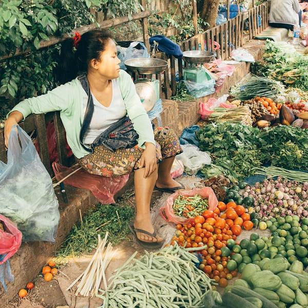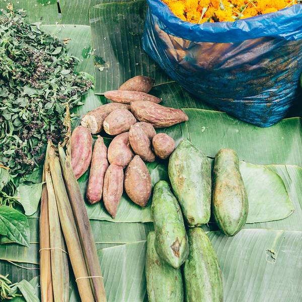 那些想看又不敢看的“商品”:用芭蕉叶铺着的摊位上,刚从河里打捞上来的鲶鱼以及叫不出名的河鱼一脸的生无可恋,隔壁是不知道何物的肉干,新鲜的蔬菜放在五颜六色的袋子里,薄荷、罗勒、柠檬草……的香味混杂在空气中,潮湿中裹挟着清新气息,河泥的土味和植物的草香钻入鼻腔,停留在颅内。端着相机,被摊位上的商品的缤纷色彩所吸引,蔬菜瓜果的摆放颇具艺术感,如同一幅幅颜色漂亮的静物画,艳丽的西红柿、清脆的绿叶蔬菜、娇羞的芒果、低调内敛的莲藕、诱人的蓝莓……构成了调色板上的一抹抹明艳的色彩。《假如真有时光机》一书中提到的烤粘糕,“有种令人怀念的滋味,相当好吃。”穿着特色筒裙,盘起头发,簪上鲜花,这便是当地女人最美丽的打扮,逛市场,是最能亲近生活的一种方式,我着迷于这样的日常。
