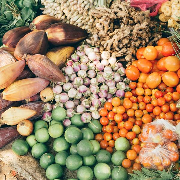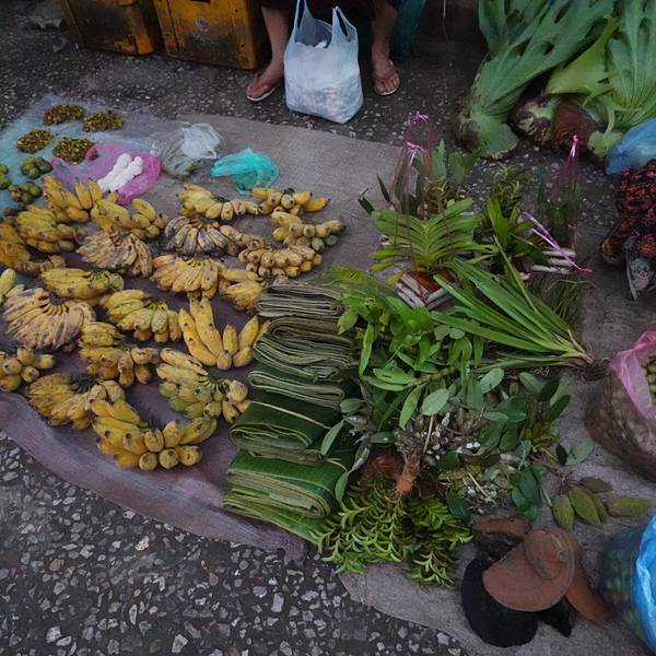 想看到本地早市,还得起一大早。王宫博物馆旁的巷子里已经熙熙攘攘。 那些想看又不敢看的“商品”:用芭蕉叶铺着的摊位上,刚从河里打捞上来的鲶鱼以及叫不出名的河鱼一脸的生无可恋,隔壁是不知道何物的肉干,新鲜的蔬菜放在五颜六色的袋子里,薄荷、罗勒、柠檬草……的香味混杂在空气中,潮湿中裹挟着清新气息,河泥的土味和植物的草香钻入鼻腔,停留在颅内。端着相机,被摊位上的商品的缤纷色彩所吸引,蔬菜瓜果的摆放颇具艺术感,如同一幅幅颜色漂亮的静物画,艳丽的西红柿、清脆的绿叶蔬菜、娇羞的芒果、低调内敛的莲藕、诱人的蓝莓……构成了调色板上的一抹抹明艳的色彩。《假如真有时光机》一书中提到的烤粘糕,“有种令人怀念的滋味,相当好吃。”穿着特色筒裙,盘起头发,簪上鲜花,这便是当地女人最美丽的打扮,逛市场,是最能亲近生活的一种方式,我着迷于这样的日常。