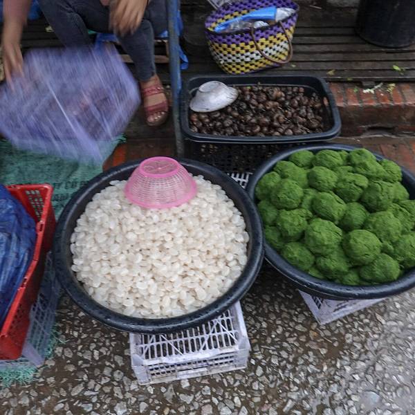 琅勃拉邦的早市是当地人都去购买东西的地方,布施结束,刚好可以去逛一逛早市。这里到处都是小贩,兜售着令人眼花缭乱的五金器具和成堆的新鲜土特产品,也能够淘到许多纯正的本地货或者土特产,而且最有意思的是有很多奇奇怪怪的东西……早市真的有趣,老鼠有烤的,炸的,剥皮的,还有风干的…小青蛙小螺蛳…还有卖蝙蝠的,把蝙蝠串成一串…还有各类野菜 有糯米饭,串串,各类早餐~ 有些影响食欲的就不发图了,影响食欲[拜拜]好奇宝宝…这个是什么鱼?!挖槽…剥了皮的老鼠!!闭着眼睛把相机调到最大按下快门赶紧跑…居然拍糊了…剥皮鼠加强版之开肚???前面的加强版风干鼠……这个看着还可以接受这个是……迷你恐龙吧……估计是炭烤的老鼠这么小的青蛙…怎么吃呀…串成一串的蝙蝠…导游说老挝人喜欢油炸…???emmm…他们开心就好(不要质疑为什么拍糊了看不清楚,这东西没法走近拍啊……)右二还真的是看着没什么食欲诶…总算看到点正常的东西了…赏心悦目舒服舒服这是机器剥的吧…和珍珠一样…