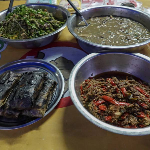 有些影响食欲的就不发图了,影响食欲[拜拜]好奇宝宝…这个是什么鱼?!挖槽…剥了皮的老鼠!!闭着眼睛把相机调到最大按下快门赶紧跑…居然拍糊了…剥皮鼠加强版之开肚???前面的加强版风干鼠……这个看着还可以接受这个是……迷你恐龙吧……估计是炭烤的老鼠这么小的青蛙…怎么吃呀…串成一串的蝙蝠…导游说老挝人喜欢油炸…???emmm…他们开心就好(不要质疑为什么拍糊了看不清楚,这东西没法走近拍啊……)右二还真的是看着没什么食欲诶…总算看到点正常的东西了…赏心悦目舒服舒服这是机器剥的吧…和珍珠一样…