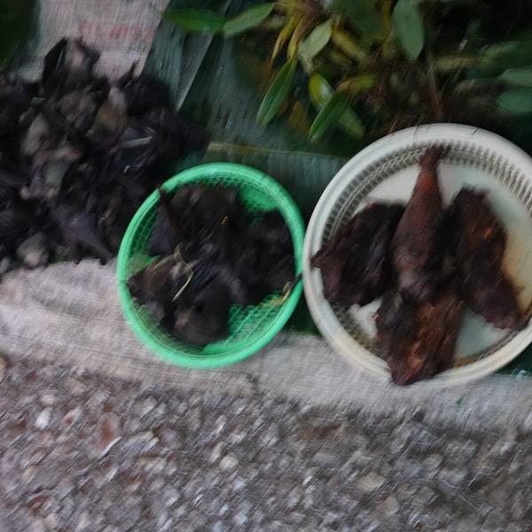 3-5只串在一起出售的蝙蝠用来点火的木材早饭后去浦西山下、王宫博物馆旁的早市买了1kg大米,9000kip/kg。还买了一梳香蕉,5000kip。琅勃拉邦省苏发努冯大学学生寝室,旧式上下铺木床,几十人一间大学教室