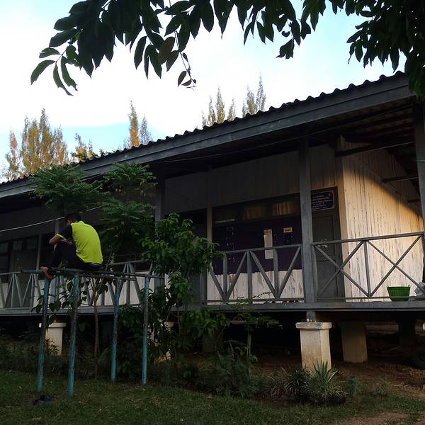 - 学生寝室,旧式上下铺木床,几十人一间。3-5只串在一起出售的蝙蝠。还买了一梳香蕉,5000kip